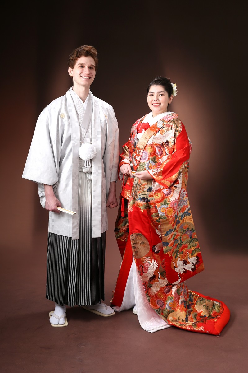 アメリカ出身の新郎様も白地のお着物がとてもお似合いです!(^^)!
