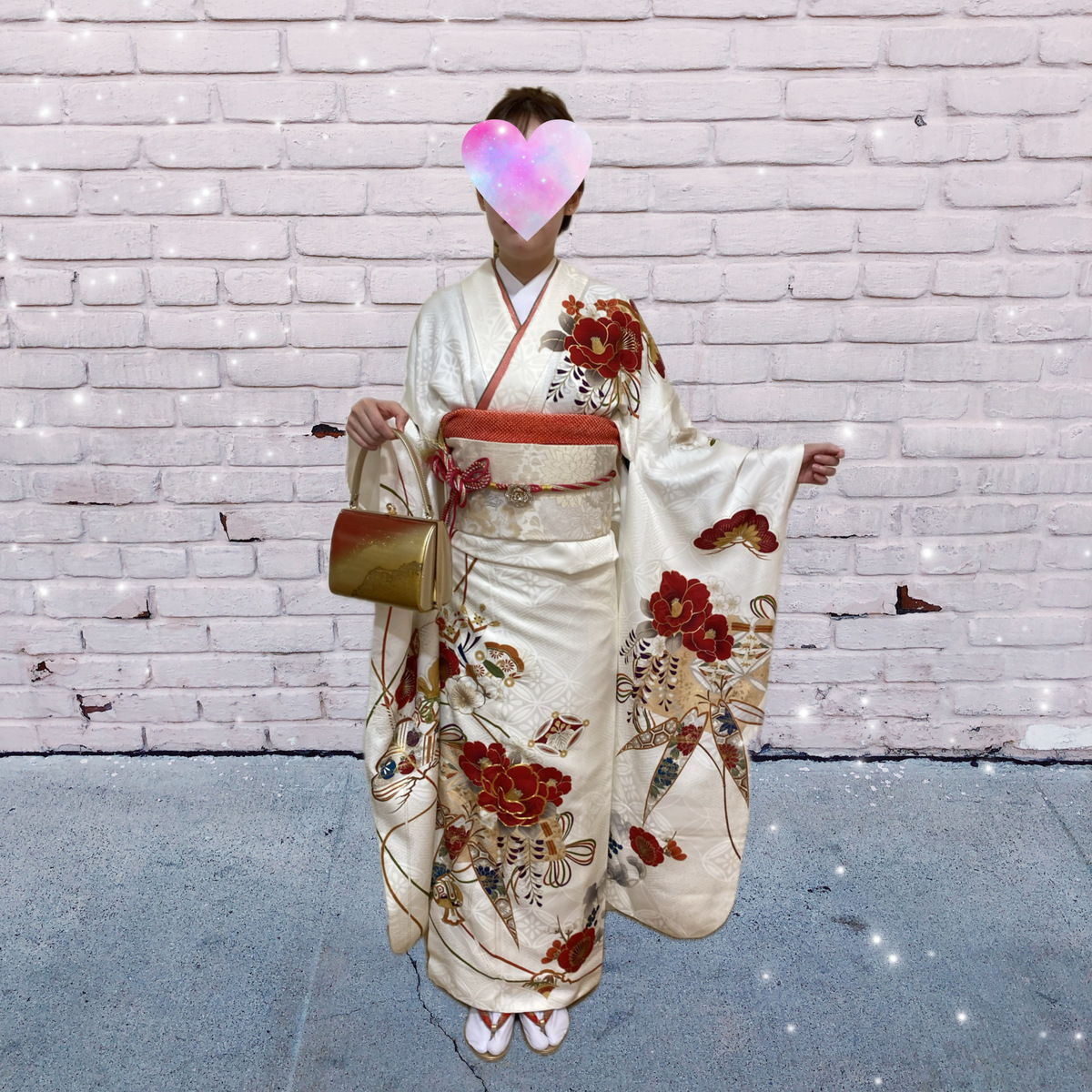 マーベラスブランドのお振袖は、白地に華やかな赤の花模様が美しく彩ります。