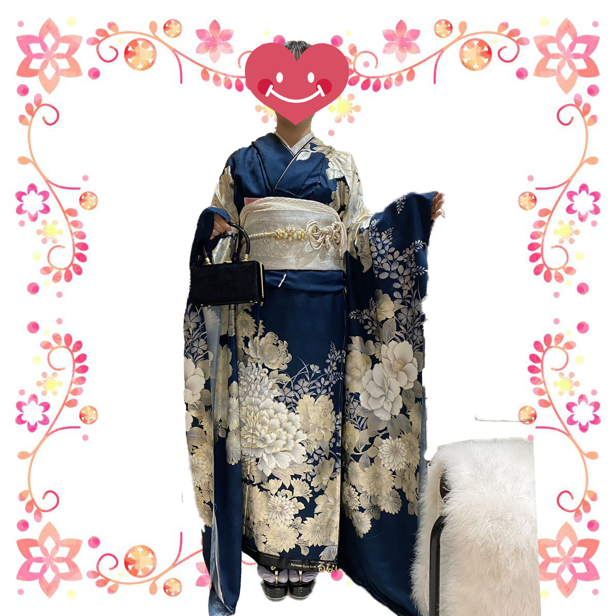 濃い青地に大柄のお花が入ってシンプルで豪華なお着物です♪