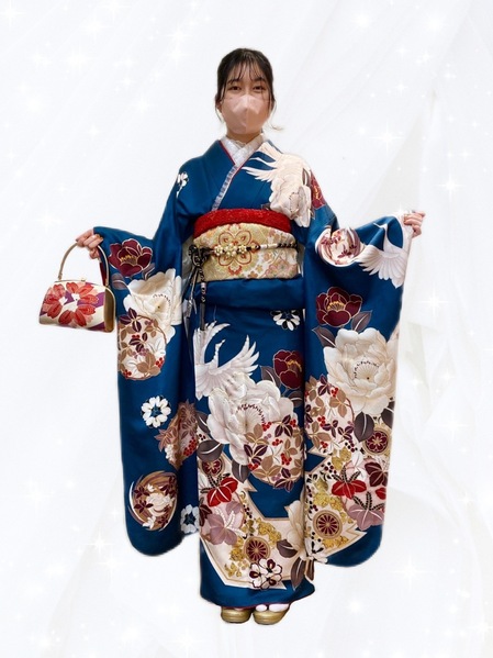 青地に羽ばたく鶴やお花が描かれ、躍動感のある振袖★