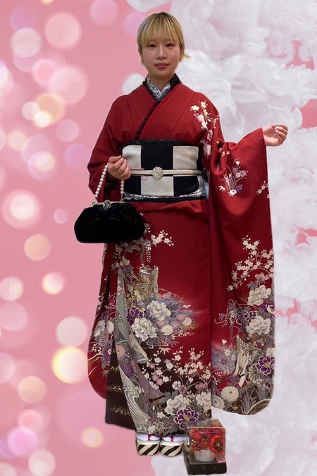 深紅が美しい古典柄のお振袖にイマドキな小物や帯でコーディネート。
