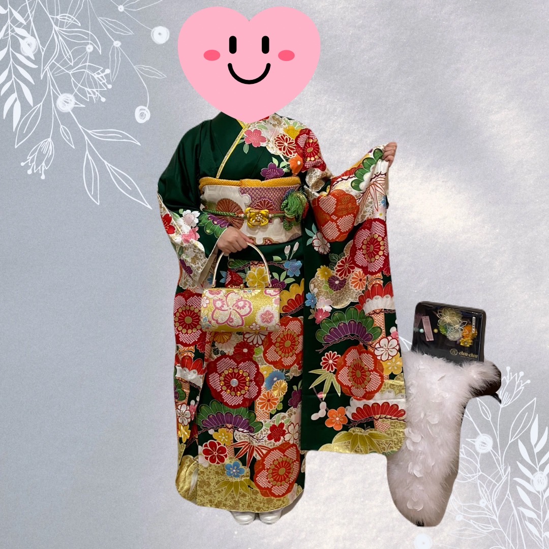 深いグリーンに細かいお花がとても可愛らしい振袖です!
