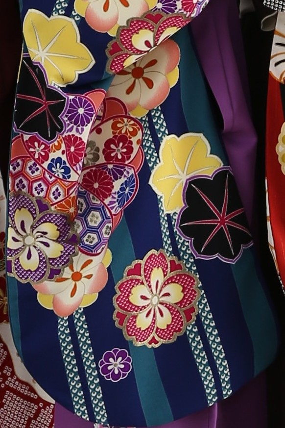 振りには丸くデザインされた桜や梅が詰め込まれたかわいらしい着物です。