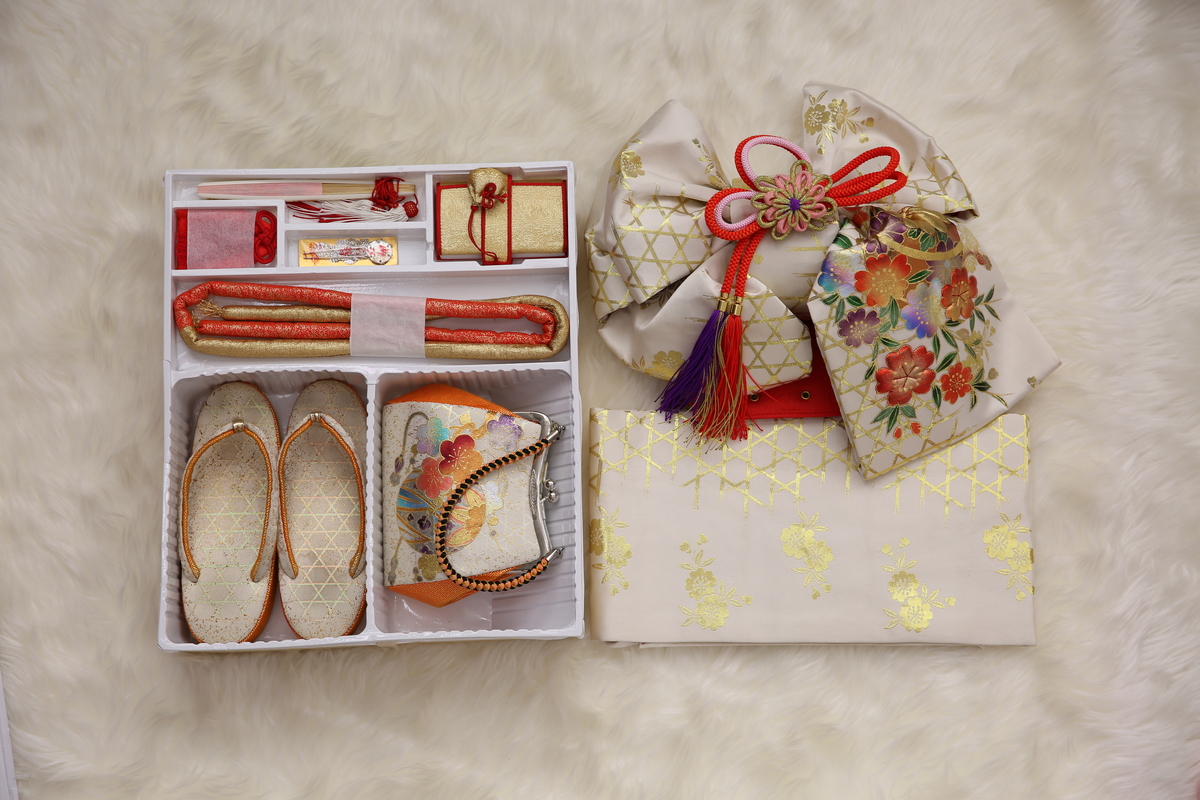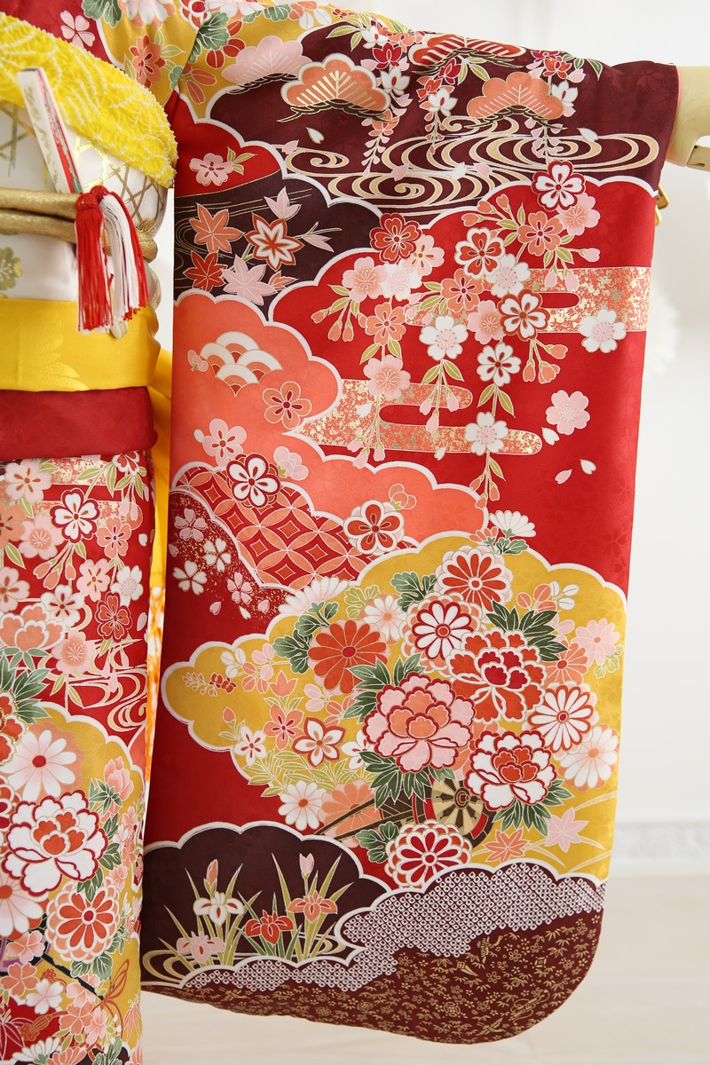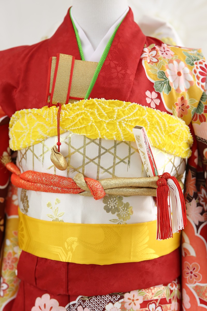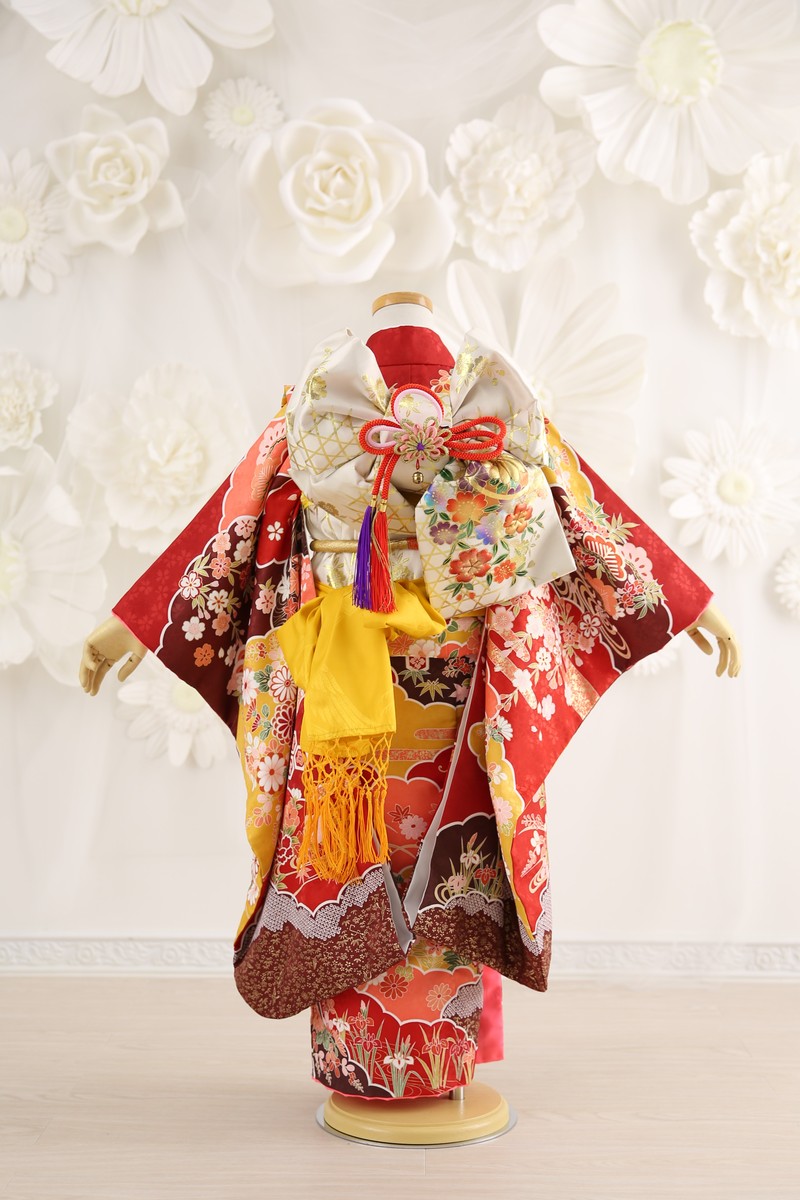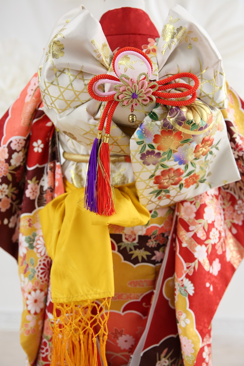 7歳の女の子は、長袖の着物に七五三用の帯をつけ、帯下には「しごき」を締めます。