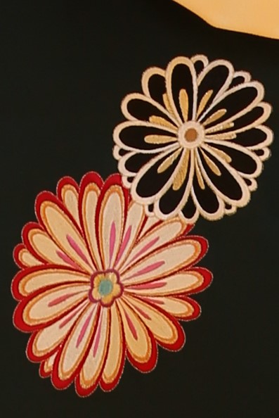 着物:クリーム地に黒や赤などで梅模様などが入った着物