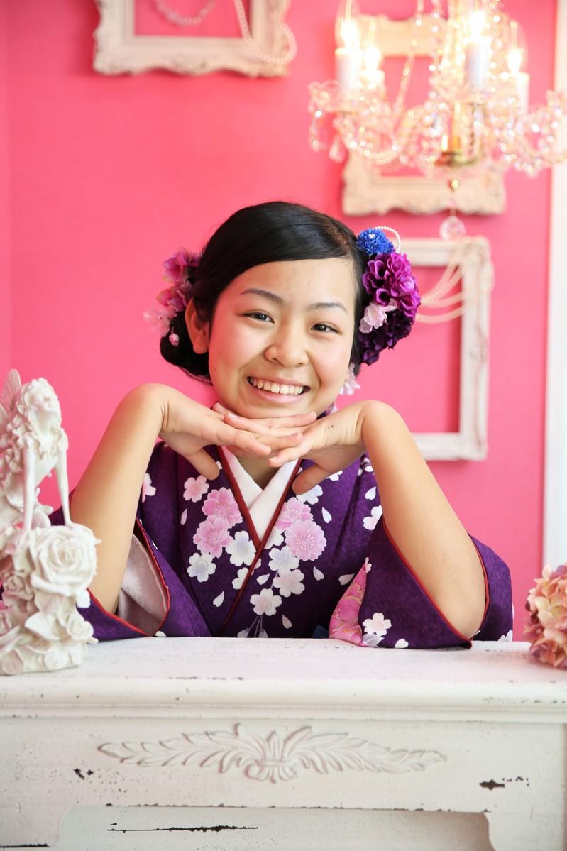着物:紫の生地に可愛い小さなお花がたくさん書いてあります