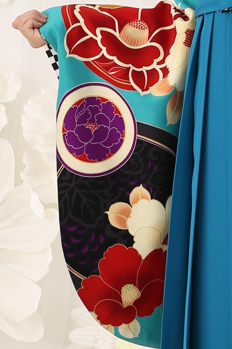 鮮やかな空色に大きく描かれた椿や菊の紋がレトロで華やかなお着物。