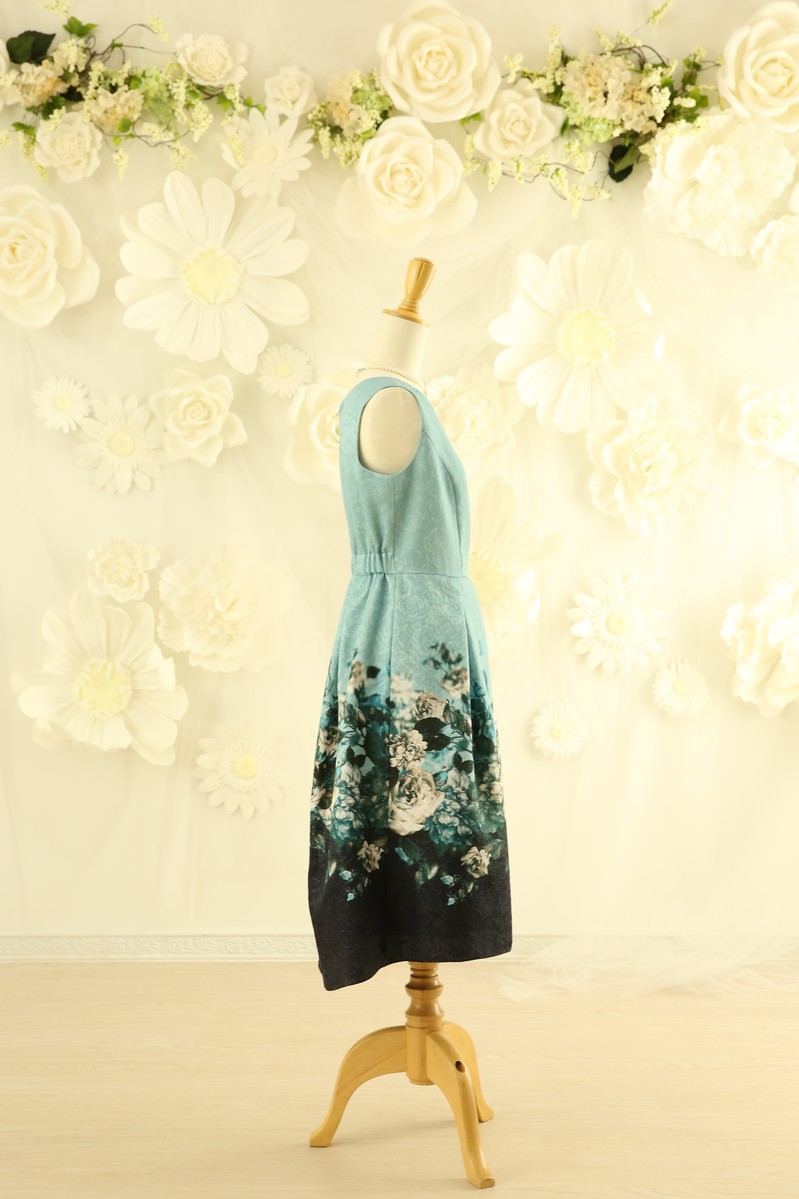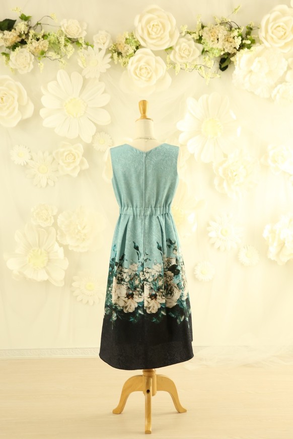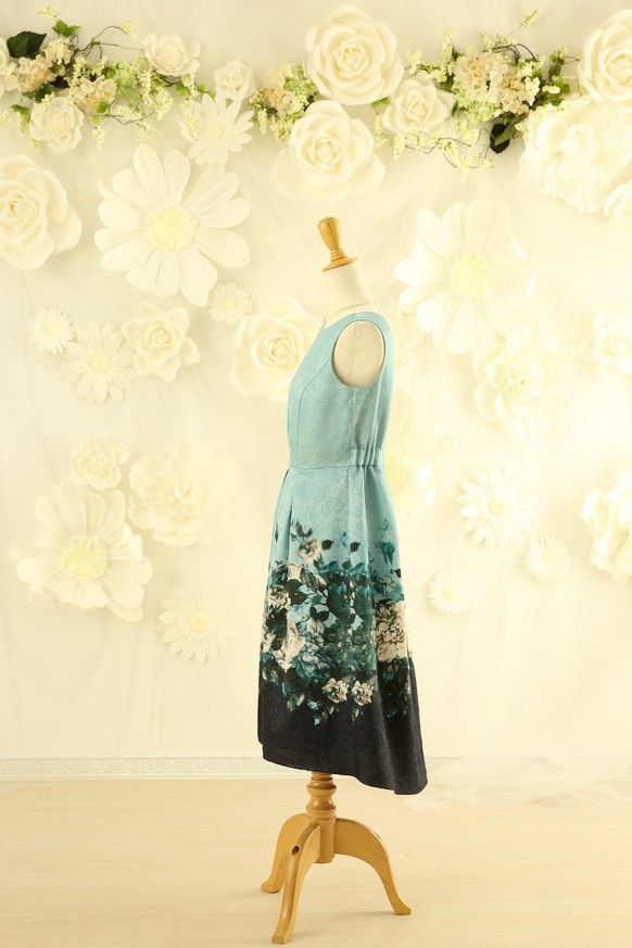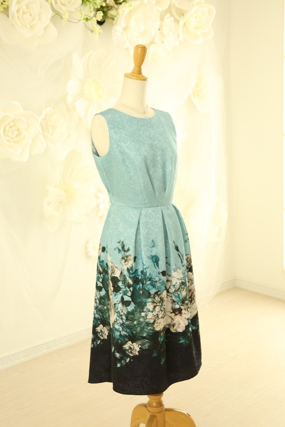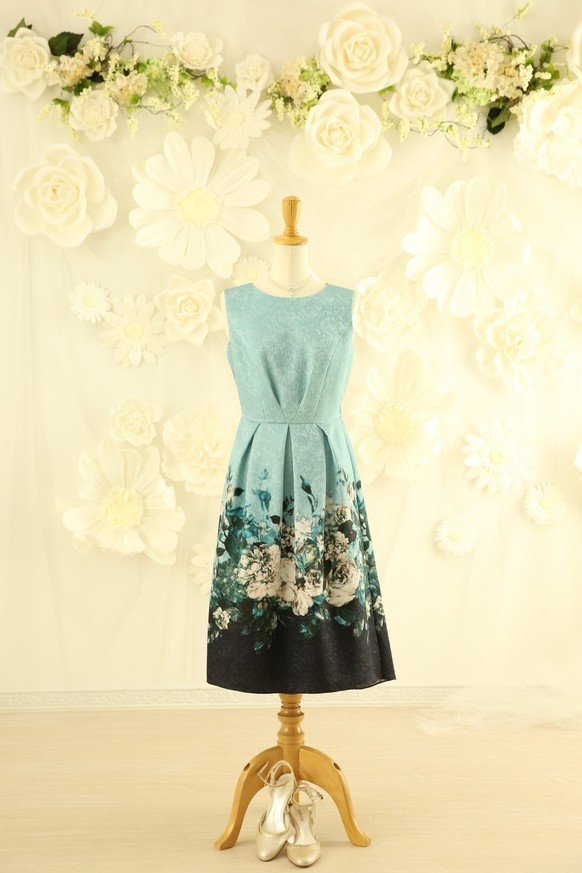 特徴 :柔らかい水色に花柄プリントのフラワーモチーフのシルエットが綺麗ドレス
