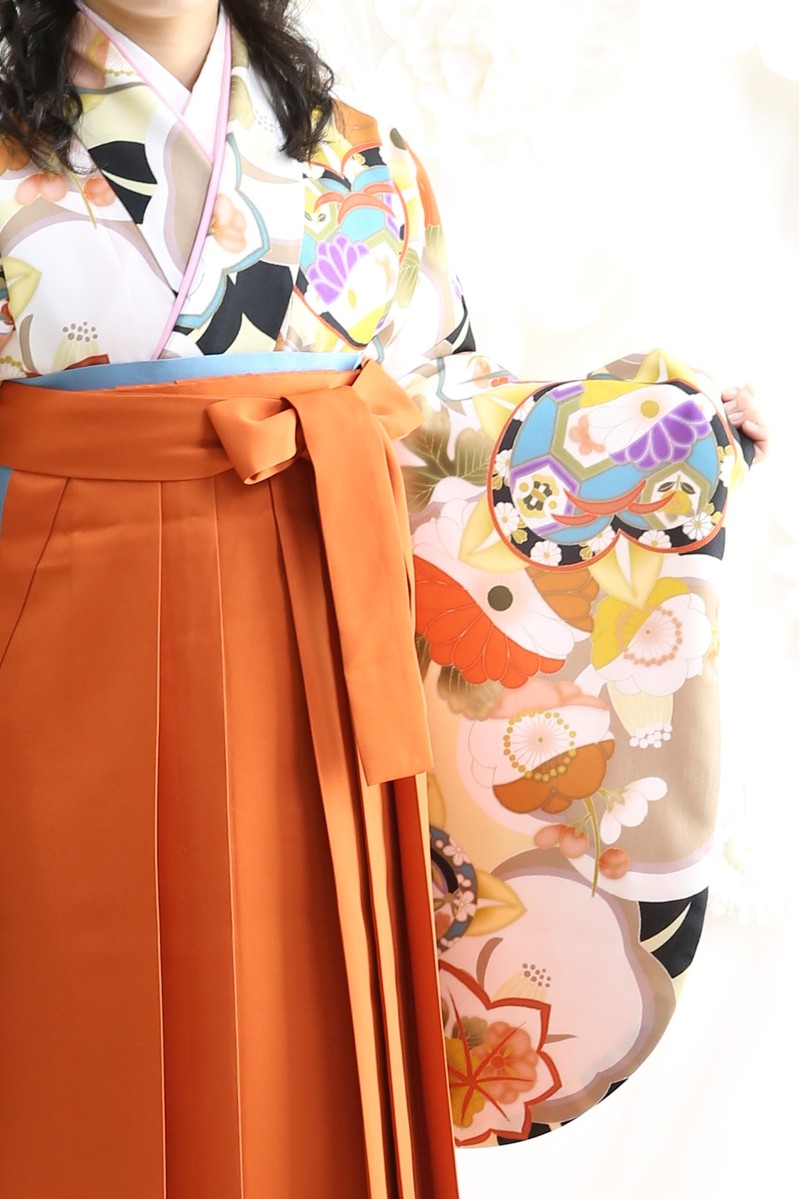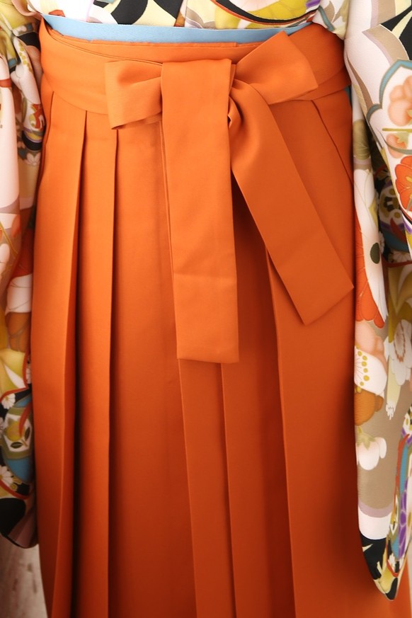 袴:オレンジの袴にワンポイント貝合わせ風の柄の刺繍