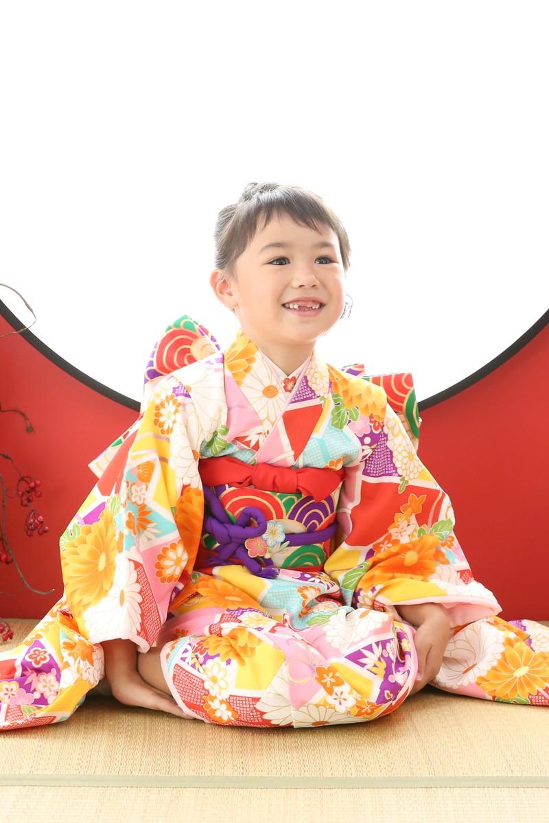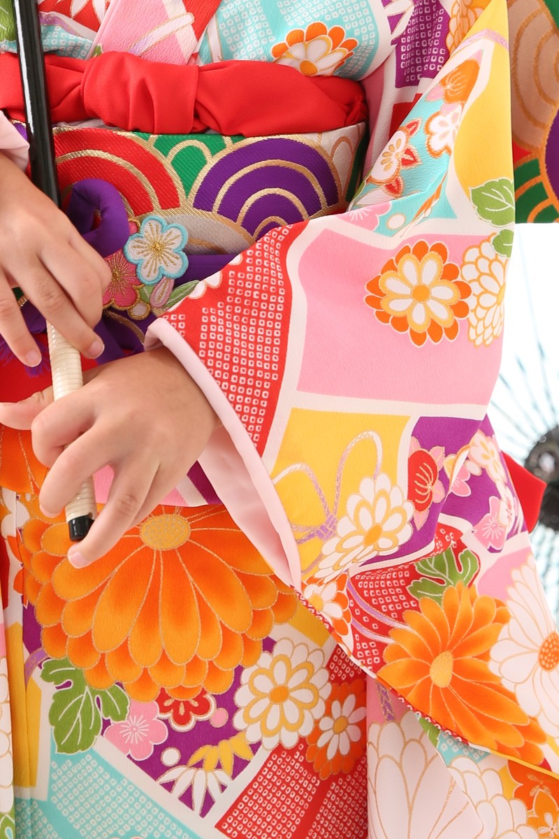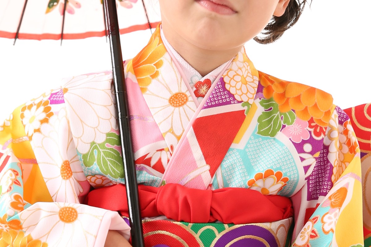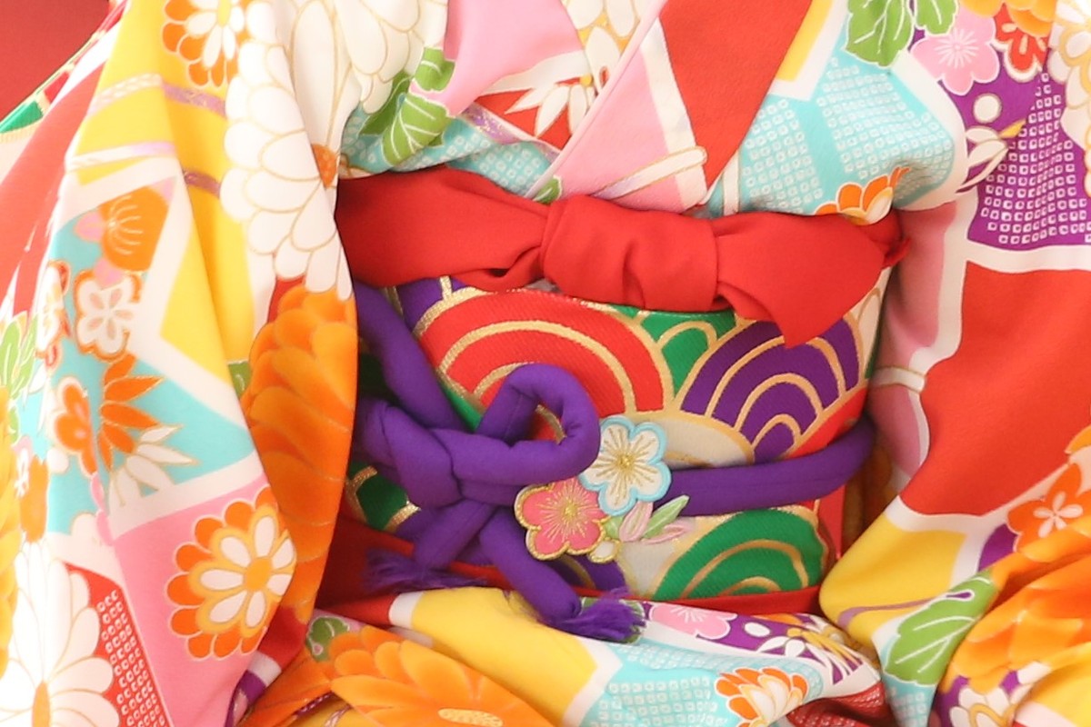 7歳の女の子は、長袖の着物に七五三用の帯をつけ、帯下には「しごき」を締めます。