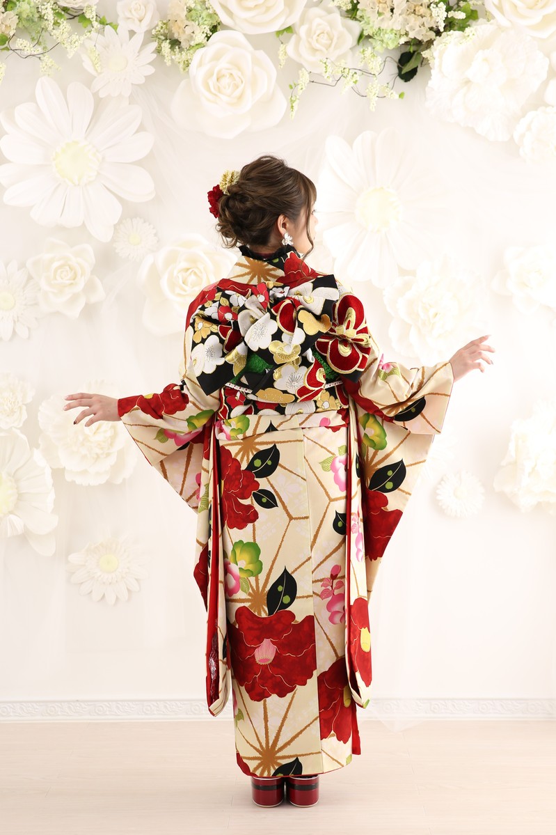 クリーム地に赤の大きく椿が入ったお振袖