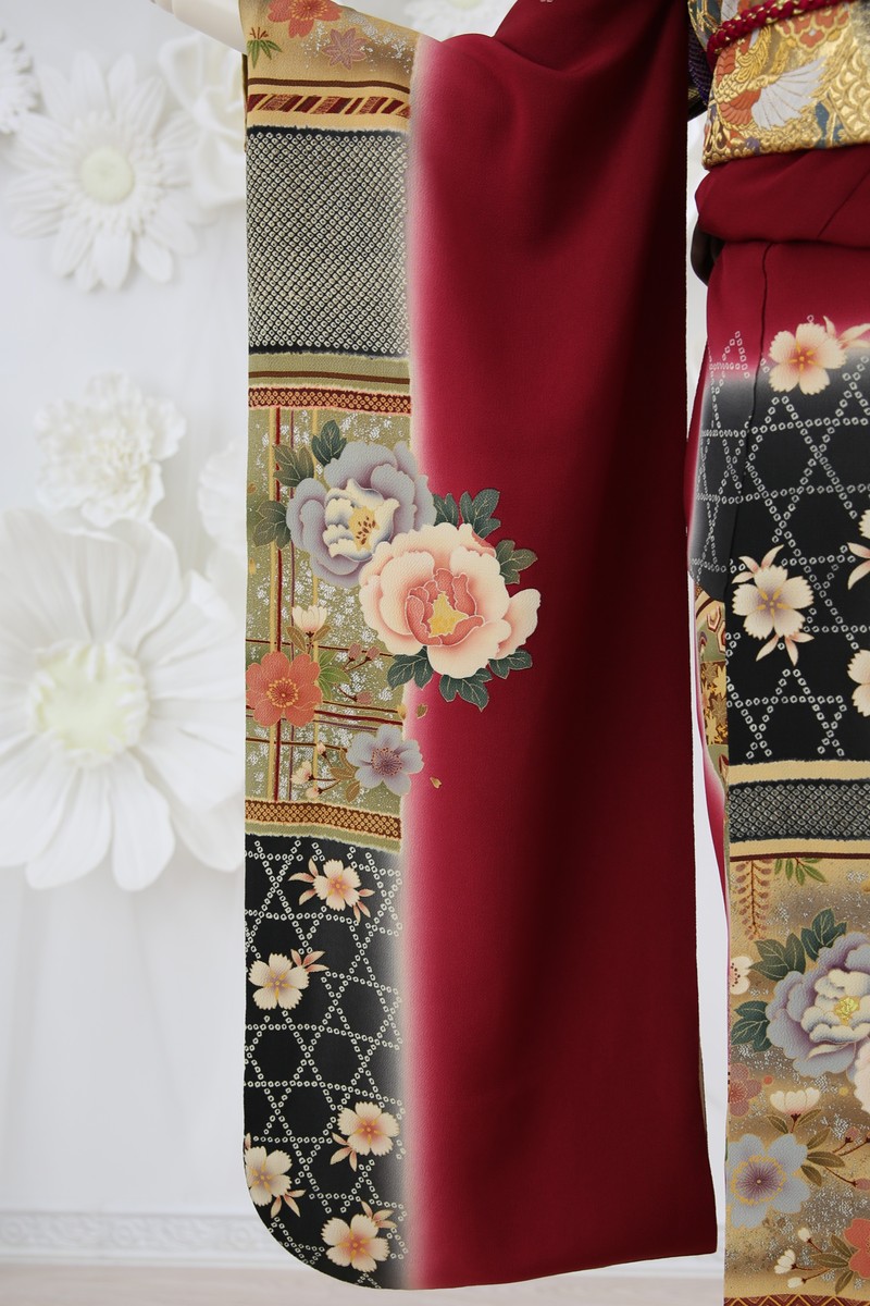 落ち着いた赤に桜や牡丹、扇なのどの古典柄の振袖です。