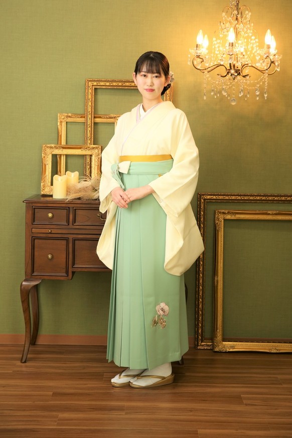 袴はラフィネモカブランドのくすみグリーンの袴でレトロ感を意識した