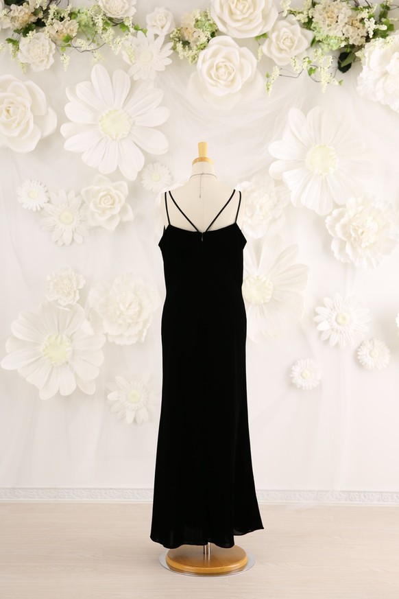 特徴 :ベルベット生地、胸元にオーガンジーのフリルのあるロングドレスです。