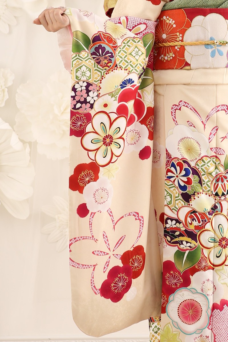 クリーム地の振袖に赤の絞りの桜柄や丸みのある梅やもみじが入っています。