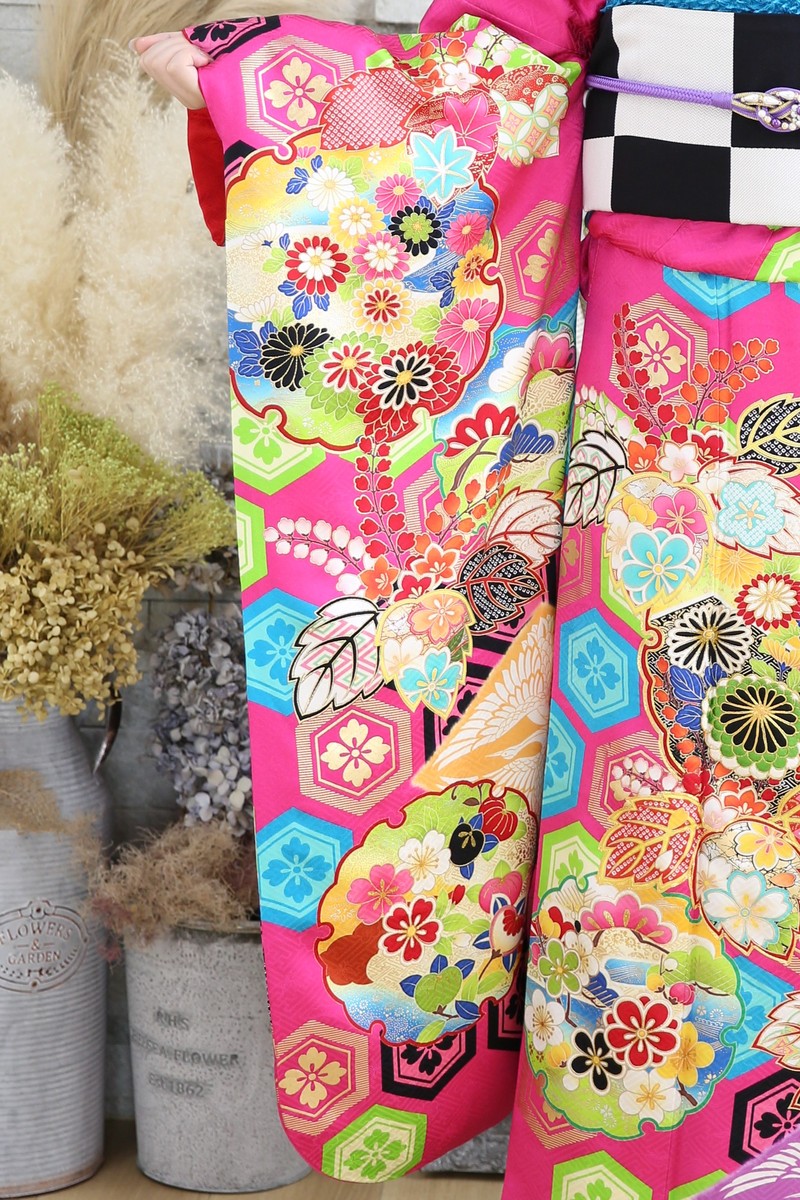 鮮やかなピンク地に水色や黒などの色様々な文様が入った今どき振袖
