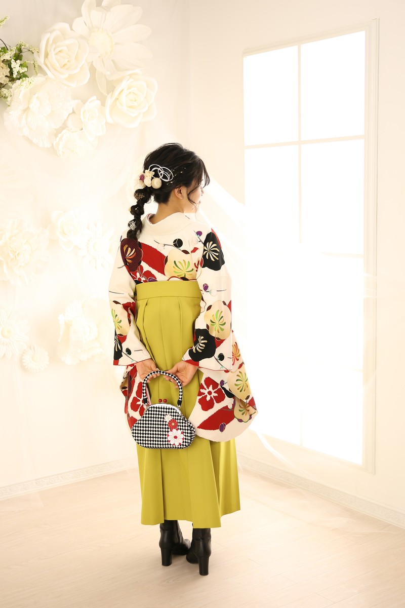 袴:明るい黄緑色の袴にも、かわいらしさを底上げするワンポイントの椿の文様が。