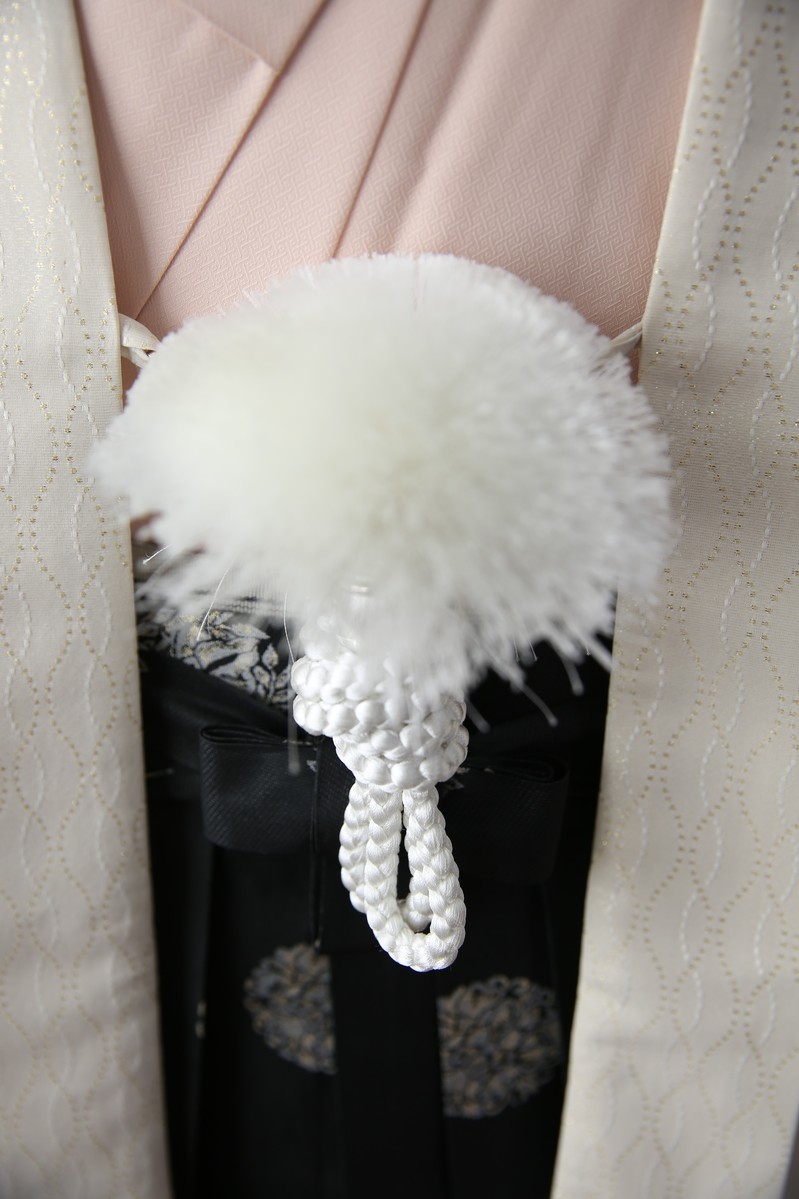 アイテム情報 :オシャレなピンクの優しいお着物に黒の袴でかっこよく♪