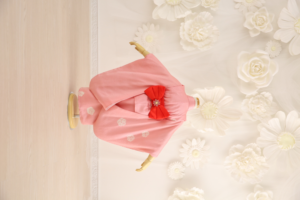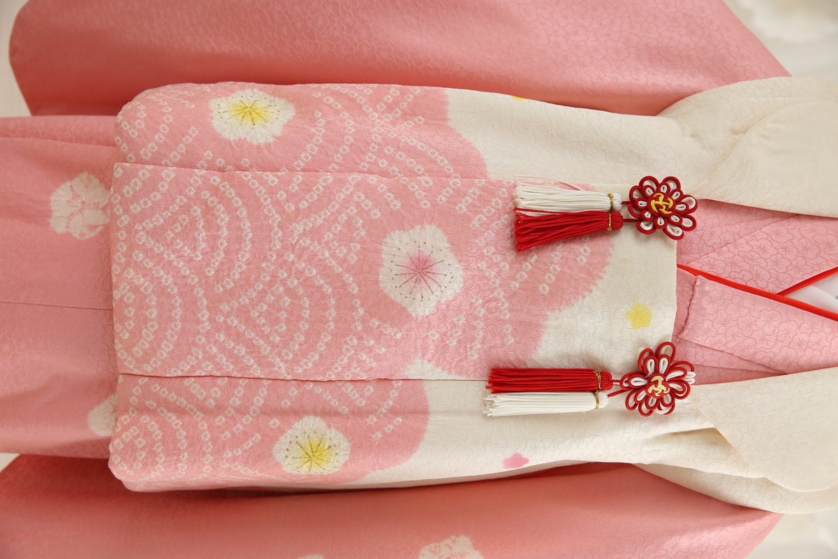 7歳の女の子は、長袖の着物に七五三用の帯をつけ、帯下には「しごき」を締めます。