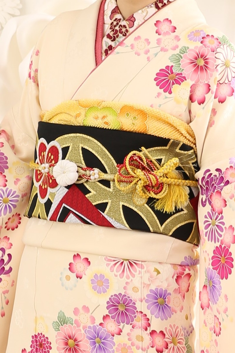 菊や桜がピンク色で描かれており、クリーム・紫・ピンクの色味がとてもマッチした