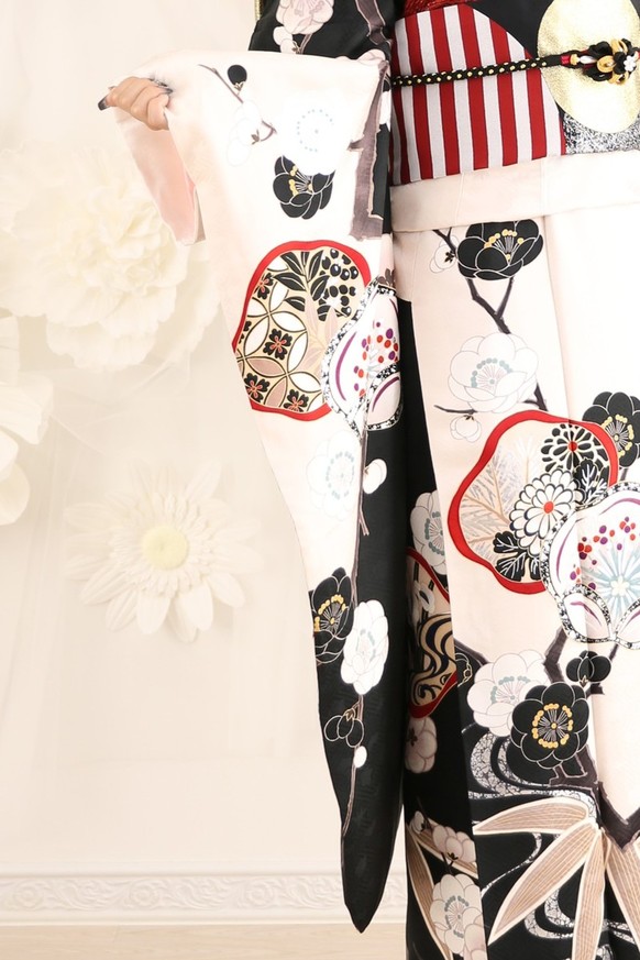 クリーム色と黒を基本に染められているこだわりの振袖。