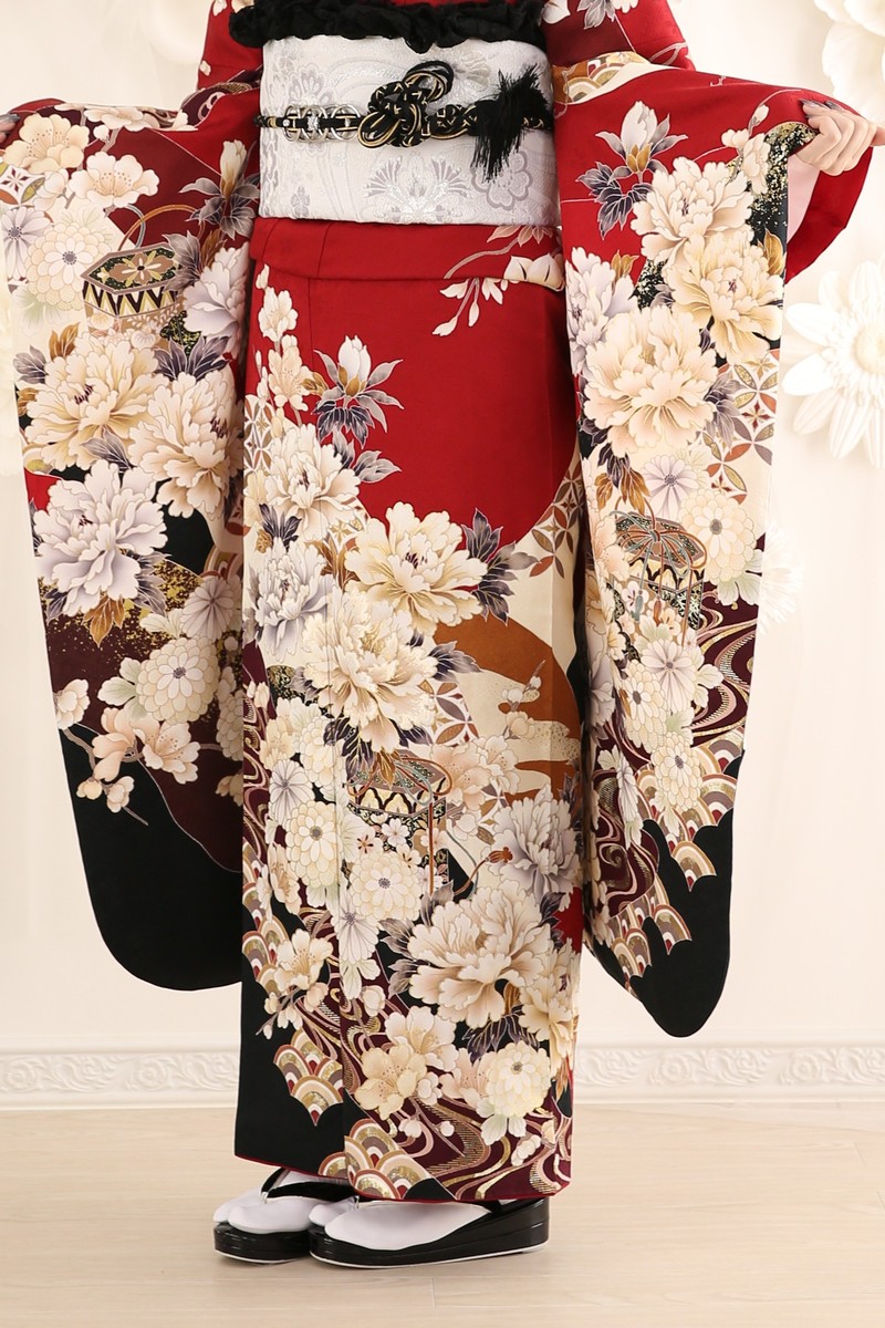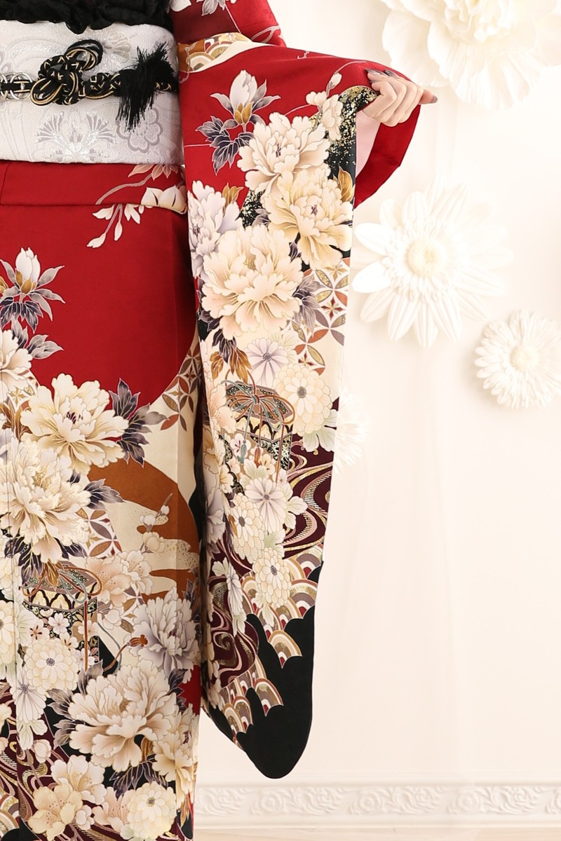 アイテム情報 :深紅の正統派古典柄にあわせた人気のくすみ配色。 今どきのトーンコーディネートにもピッタリな一枚。 他にはない最旬赤色振袖。