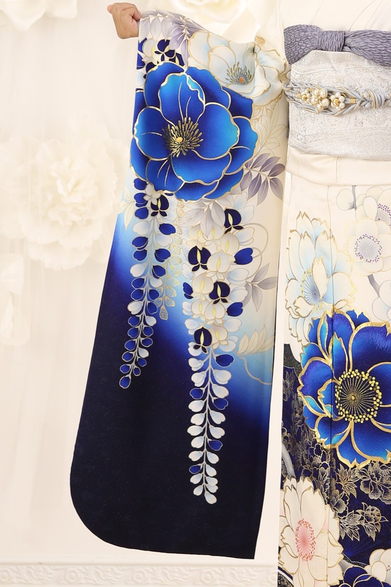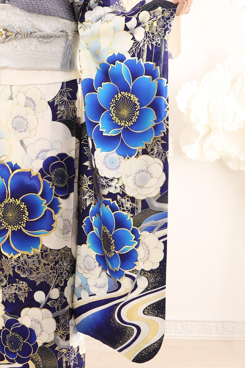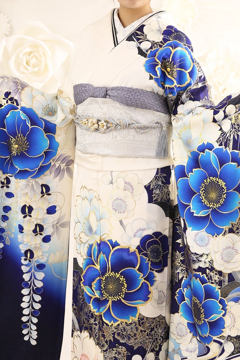 白地にブルーの色使いが美しい牡丹が描かれた上品でカッコいい大人なデザイン振袖。